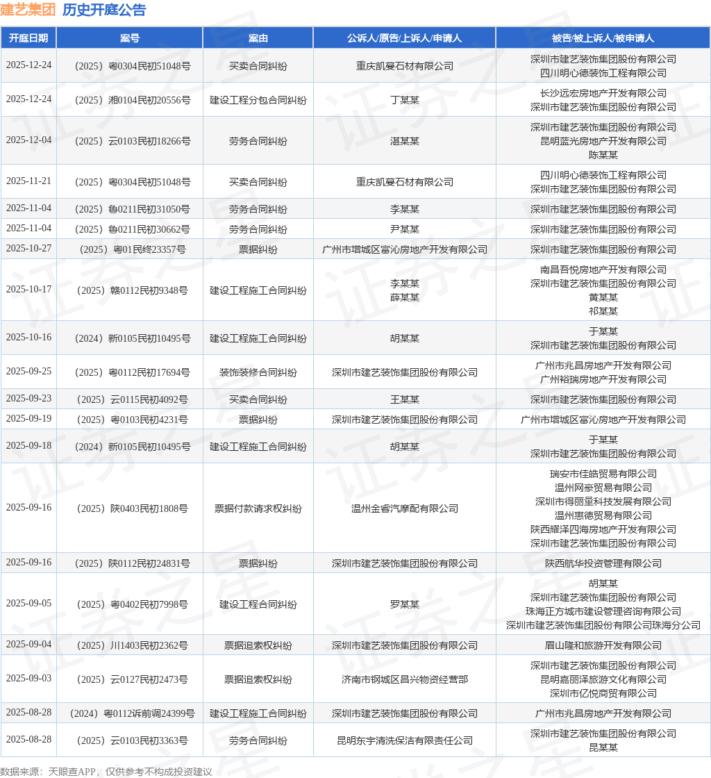 案号:(2025)粤0304民初51048号根据统计,近一年内以深圳市建艺装饰集团股份有限公司为当事人的历史开庭公告有131则,其中案由为“装饰装修合同纠纷”的公告以27则居首,其次为“票据纠纷”有25则,“建设工程施工合同纠纷”有22则。历史开庭公告(前20条)如下: