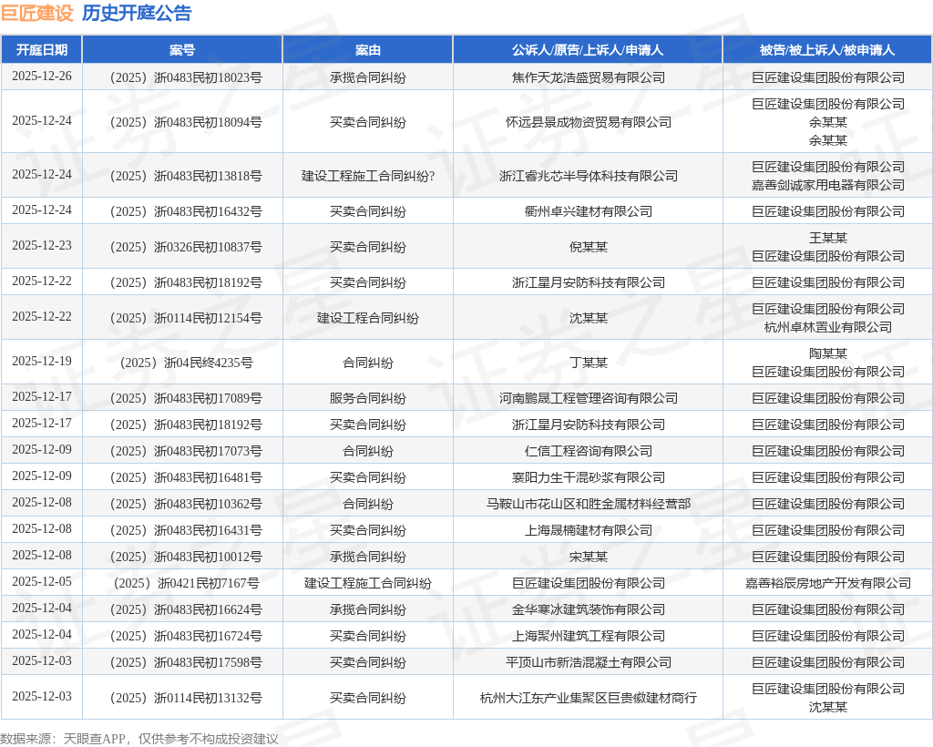 案号:(2025)浙0483民初13818号根据统计,近一年内以巨匠建设集团股份有限公司为当事人的历史开庭公告有231则,其中案由为“买卖合同纠纷”的公告以81则居首,其次为“合同纠纷”有37则,“建设工程施工合同纠纷”有24则。历史开庭公告(前20条)如下: