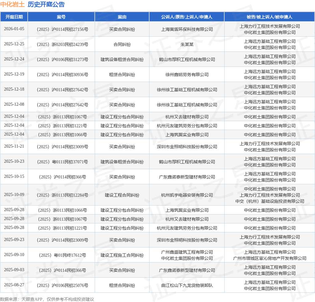 案号:(2025)沪0106民初31273号根据统计,近一年内以中化岩土集团股份有限公司为当事人的历史开庭公告有49则,其中案由为“买卖合同纠纷”的公告以12则居首,其次为“建设工程分包合同纠纷”有11则,“建设工程合同纠纷”有8则。历史开庭公告(前20条)如下: