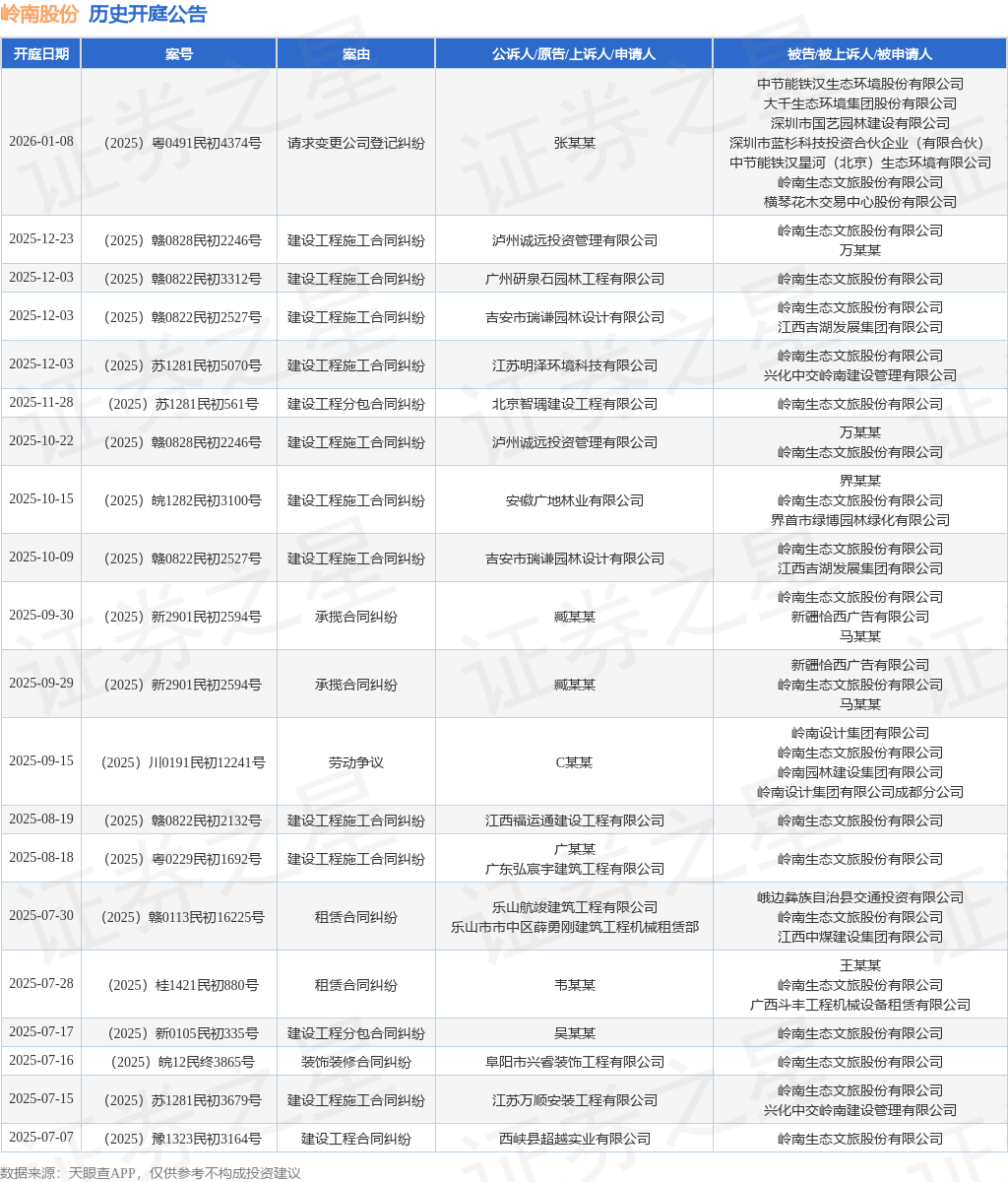 案号:(2025)赣0828民初2246号根据统计,近一年内以岭南生态文旅股份有限公司为当事人的历史开庭公告有80则,其中案由为“建设工程施工合同纠纷”的公告以28则居首,其次为“建设工程合同纠纷”有14则,“建设工程分包合同纠纷”有10则。历史开庭公告(前20条)如下: