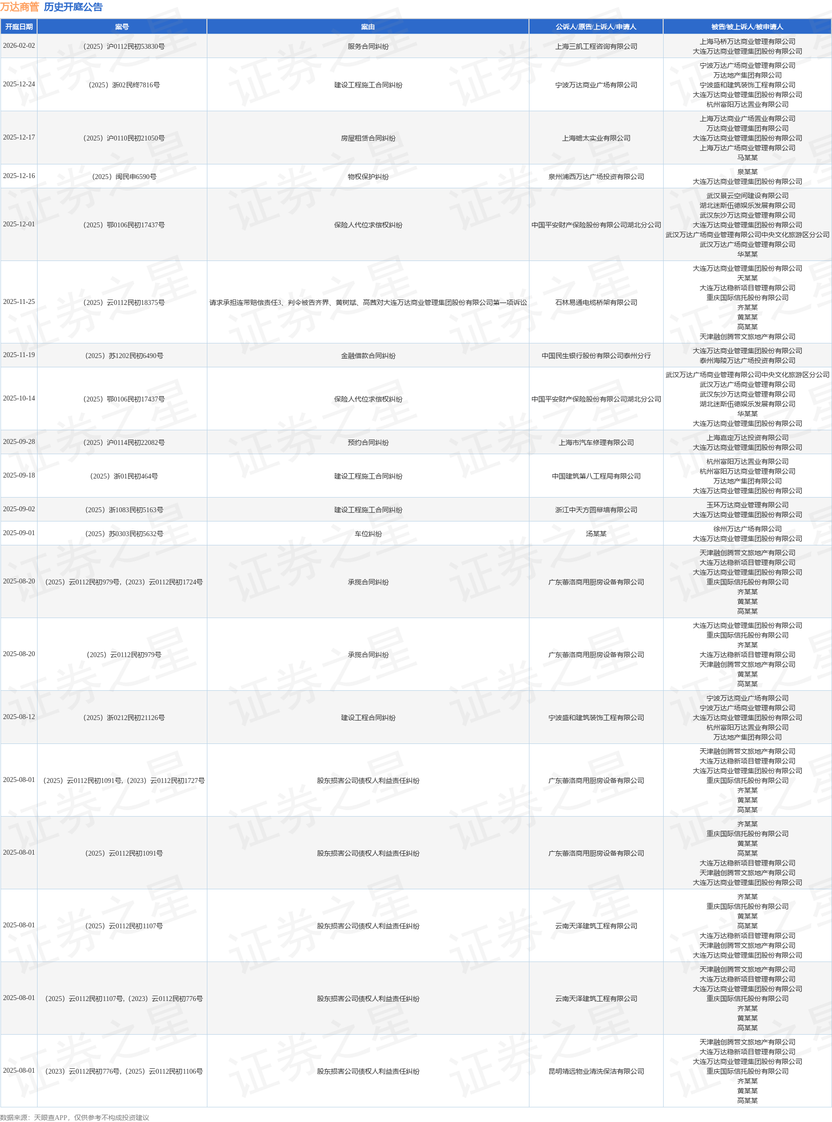 案号:(2025)浙02民终7816号根据统计,近一年内以大连万达商业管理集团股份有限公司为当事人的历史开庭公告有78则,其中案由为“股东损害公司债权人利益责任纠纷”的公告以16则居首,其次为“承揽合同纠纷”有10则,“建设工程施工合同纠纷”有9则。历史开庭公告(前20条)如下: