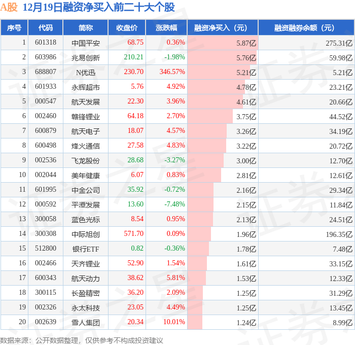 A股融资净买入前三分别为:中国平安(601318)融资净买入5.87亿元、兆易创新(603986)融资净买入5.76亿元、N优迅(688807)融资净买入5.21亿元,前20具体见下表: