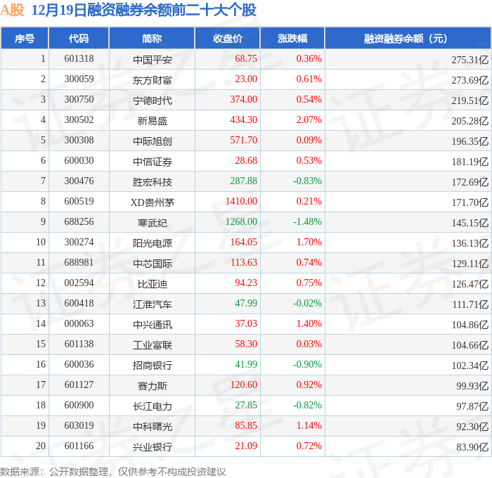 A股融资融券余额前三分别为:中国平安(601318)融资融券余额275.31亿元、东方财富(300059)融资融券余额273.69亿元、宁德时代(300750)融资融券余额219.51亿元,前20具体见下表: