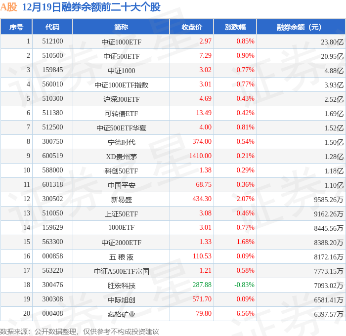 A股融券余额前三分别为:中证1000ETF(512100)融券余额23.8亿元、中证500ETF(510500)融券余额20.95亿元、中证1000(159845)融券余额4.88亿元,前20具体见下表: