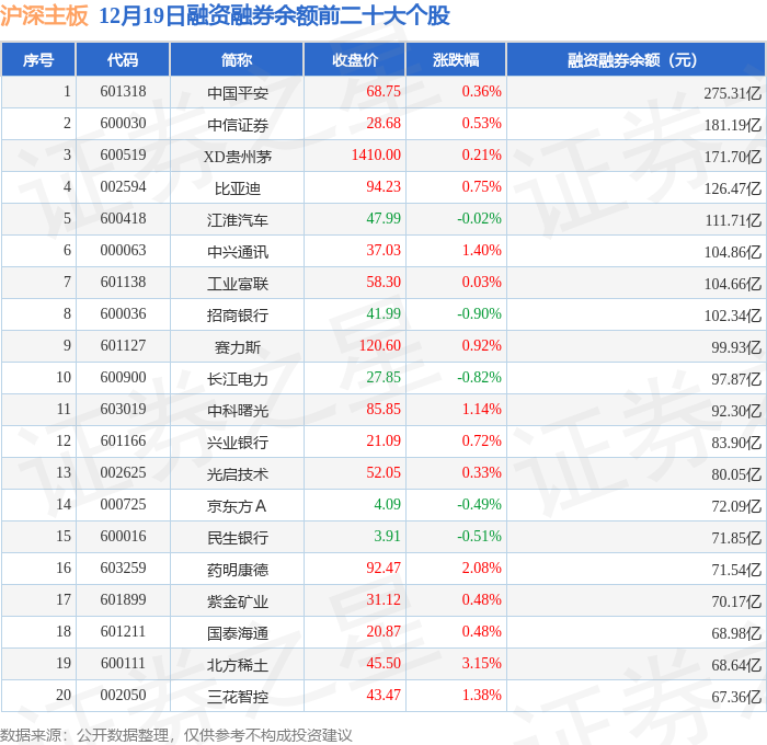 沪深主板融资融券余额前三分别为:中国平安(601318)融资融券余额275.31亿元、中信证券(600030)融资融券余额181.19亿元、XD贵州茅(600519)融资融券余额171.7亿元,前20具体见下表: