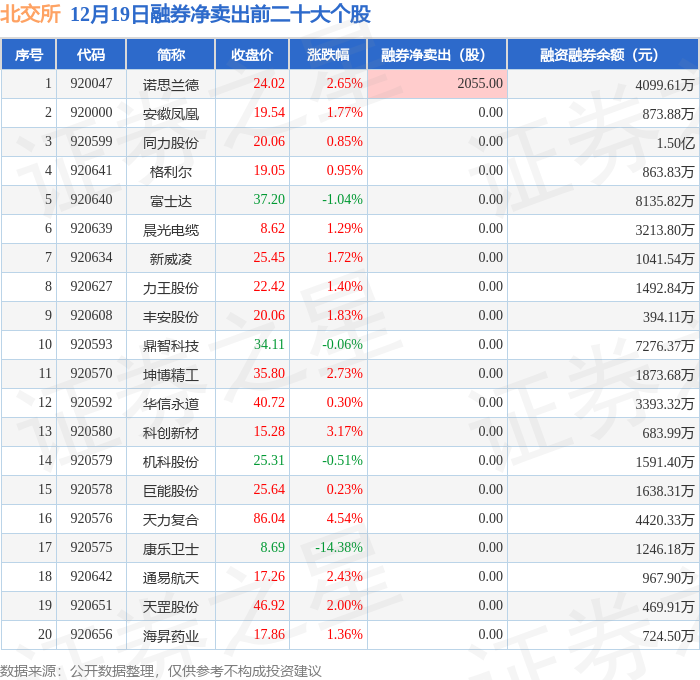 北交所融券净卖出前三分别为:诺思兰德(920047)融券净卖出2055股,前20具体见下表: