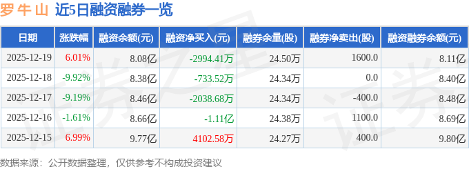 罗 牛 山融资融券信息显示,融资方面,当日融资买入1.69亿元,融资偿还1.99亿元,融资净偿还2994.41万元。融券方面,融券卖出1600.0股,融券偿还0.0股,融券余量24.5万股,融券余额233.49万元。融资融券余额8.11亿元。