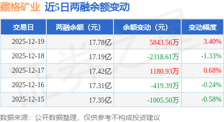 证券之星消息,12月19日,藏格矿业(000408)融资买入1.98亿元,融资偿还1.45亿元,融资净买入5382.52万元,融资余额17.14亿元。