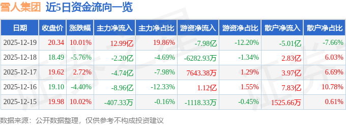 证券之星消息,截至2025年12月19日收盘,雪人集团(002639)报收于20.34元,上涨10.01%,涨停,换手率49.65%,成交量323.02万手,成交额65.4亿元。