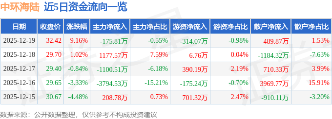 证券之星消息,截至2025年12月19日收盘,中环海陆(301040)报收于32.42元,上涨9.16%,换手率10.78%,成交量10.16万手,成交额3.21亿元。