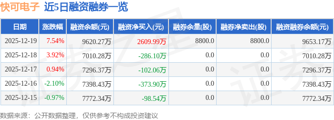 证券之星消息,截至2025年12月19日收盘,快可电子(301278)报收于37.39元,上涨7.54%,换手率22.89%,成交量11.76万手,成交额4.4亿元。