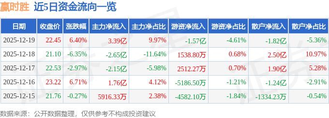 证券之星消息,截至2025年12月19日收盘,赢时胜(300377)报收于22.45元,上涨6.4%,换手率22.03%,成交量152.2万手,成交额33.98亿元。