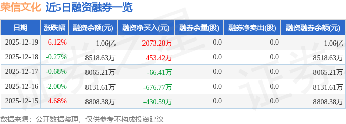 荣信文化融资融券信息显示,融资方面,当日融资买入4164.23万元,融资偿还2090.95万元,融资净买入2073.28万元。融券方面,融券卖出0.0股,融券偿还0.0股,融券余量0.0股,融券余额0.0万元。融资融券余额1.06亿元。