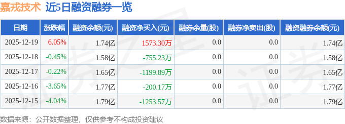 嘉戎技术融资融券信息显示,融资方面,当日融资买入4260.29万元,融资偿还2686.99万元,融资净买入1573.3万元。融券方面,融券卖出0.0股,融券偿还0.0股,融券余量0.0股,融券余额0.0万元。融资融券余额1.74亿元。