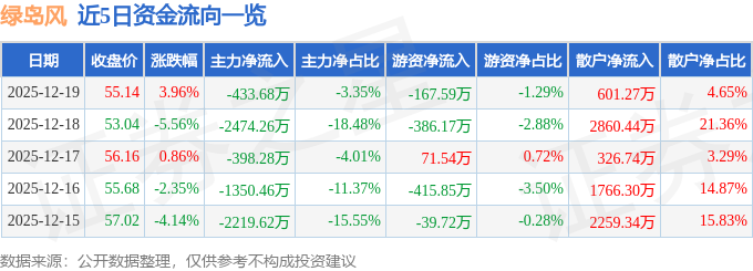 证券之星消息,截至2025年12月19日收盘,绿岛风(301043)报收于55.14元,上涨3.96%,换手率4.2%,成交量2.39万手,成交额1.29亿元。