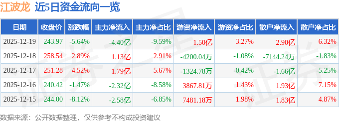 证券之星消息,截至2025年12月19日收盘,江波龙(301308)报收于243.97元,下跌5.64%,换手率6.72%,成交量18.44万手,成交额45.82亿元。