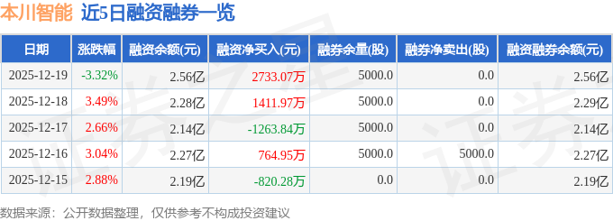 本川智能融资融券信息显示,融资方面,当日融资买入7491.57万元,融资偿还4758.5万元,融资净买入2733.07万元。融券方面,融券卖出0.0股,融券偿还0.0股,融券余量5000.0股,融券余额30.26万元。融资融券余额2.56亿元。