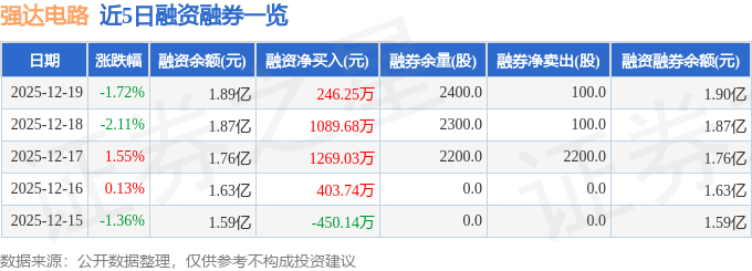 证券之星消息,截至2025年12月19日收盘,强达电路(301628)报收于88.48元,下跌1.72%,换手率4.69%,成交量1.53万手,成交额1.37亿元。