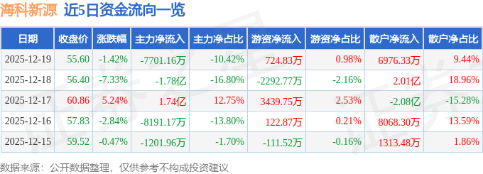证券之星消息,截至2025年12月19日收盘,海科新源(301292)报收于55.6元,下跌1.42%,换手率15.62%,成交量13.29万手,成交额7.39亿元。