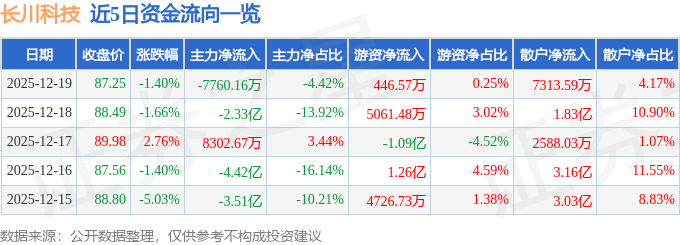证券之星消息,截至2025年12月19日收盘,长川科技(300604)报收于87.25元,下跌1.4%,换手率4.07%,成交量19.94万手,成交额17.55亿元。