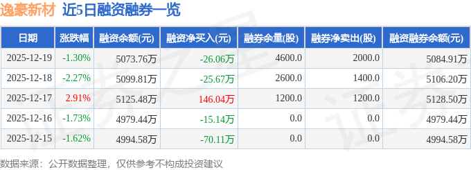 证券之星消息,截至2025年12月19日收盘,逸豪新材(301176)报收于24.25元,下跌1.3%,换手率3.39%,成交量1.91万手,成交额4682.29万元。