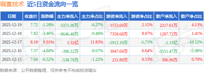 证券之星消息,截至2025年12月19日收盘,锦富技术(300128)报收于7.72元,下跌1.28%,换手率5.34%,成交量69.23万手,成交额5.38亿元。