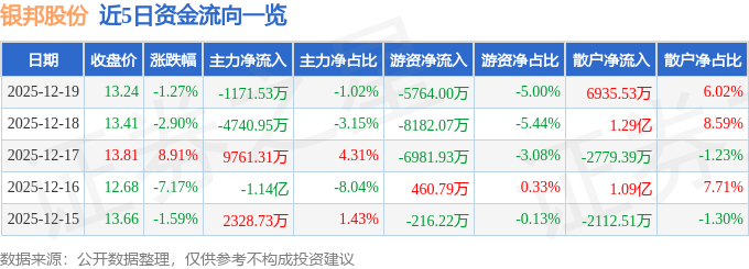 证券之星消息,截至2025年12月19日收盘,银邦股份(300337)报收于13.24元,下跌1.27%,换手率12.14%,成交量86.33万手,成交额11.52亿元。