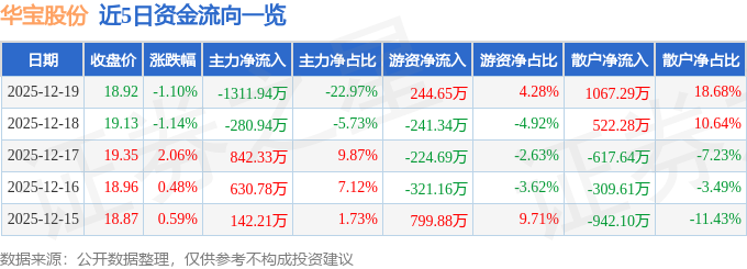 证券之星消息,截至2025年12月19日收盘,华宝股份(300741)报收于18.92元,下跌1.1%,换手率0.49%,成交量3.01万手,成交额5712.52万元。
