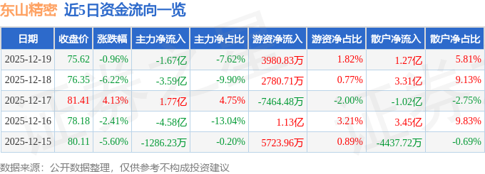 证券之星消息,截至2025年12月19日收盘,东山精密(002384)报收于75.62元,下跌0.96%,换手率2.07%,成交量28.75万手,成交额21.93亿元。