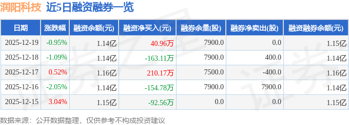 润阳科技融资融券信息显示,融资方面,当日融资买入231.12万元,融资偿还190.16万元,融资净买入40.96万元。融券方面,融券卖出0.0股,融券偿还0.0股,融券余量7900.0股,融券余额29.7万元。融资融券余额1.15亿元。