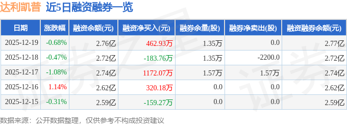 达利凯普融资融券信息显示,融资方面,当日融资买入4466.64万元,融资偿还4003.71万元,融资净买入462.93万元。融券方面,融券卖出600.0股,融券偿还600.0股,融券余量1.35万股,融券余额25.77万元。融资融券余额2.77亿元。