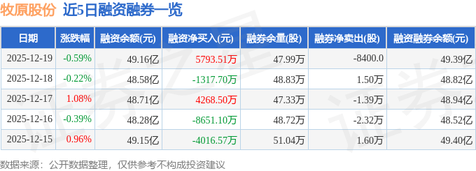 证券之星消息,截至2025年12月19日收盘,牧原股份(002714)报收于49.19元,下跌0.59%,换手率0.95%,成交量36.13万手,成交额17.99亿元。