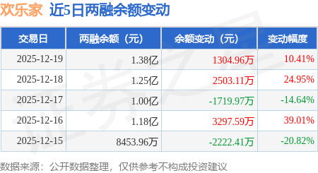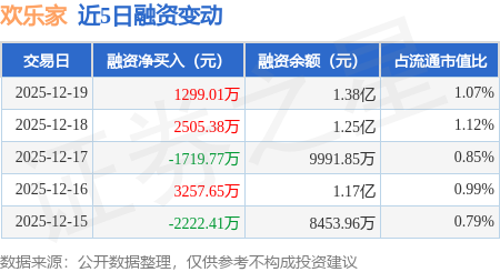 证券之星消息,12月19日,欢乐家(300997)融资买入1.1亿元,融资偿还9699.03万元,融资净买入1299.01万元,融资余额1.38亿元,近20个交易日中有11个交易日出现融资净买入。