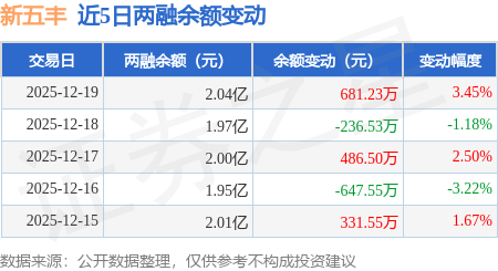 证券之星消息,12月19日,新五丰(600975)融资买入1266.08万元,融资偿还587.72万元,融资净买入678.36万元,融资余额2.03亿元。