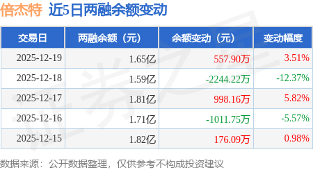 证券之星消息,12月19日,倍杰特(300774)融资买入2295.59万元,融资偿还1737.7万元,融资净买入557.9万元,融资余额1.65亿元。