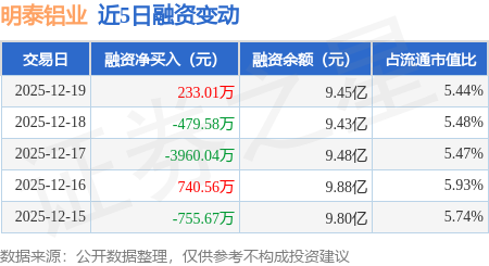 证券之星消息,12月19日,明泰铝业(601677)融资买入3151.08万元,融资偿还2918.07万元,融资净买入233.01万元,融资余额9.45亿元。