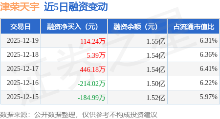 证券之星消息,12月19日,津荣天宇(300988)融资买入893.8万元,融资偿还779.56万元,融资净买入114.24万元,融资余额1.55亿元,近3个交易日已连续净买入累计565.81万元。