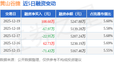 证券之星消息,12月19日,黄山谷捷(301581)融资买入346.77万元,融资偿还238.16万元,融资净买入108.6万元,融资余额5247.88万元。