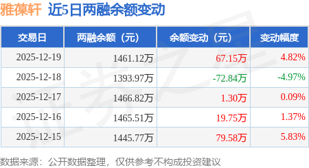 证券之星消息,12月19日,雅葆轩(920357)融资买入227.8万元,融资偿还160.65万元,融资净买入67.15万元,融资余额1461.12万元,近20个交易日中有11个交易日出现融资净买入。