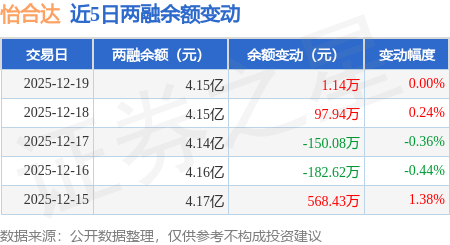 证券之星消息,12月19日,怡合达(301029)融资买入1438.45万元,融资偿还1418.94万元,融资净买入19.51万元,融资余额4.15亿元,近20个交易日中有12个交易日出现融资净买入。