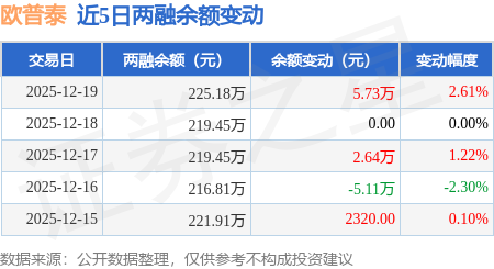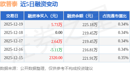 证券之星消息,12月19日,欧普泰(920414)融资买入8.37万元,融资偿还2.64万元,融资净买入5.73万元,融资余额225.18万元。