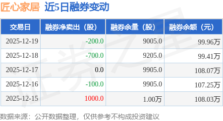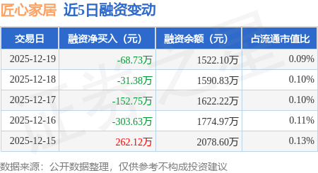 证券之星消息,12月19日,匠心家居(301061)融资买入461.93万元,融资偿还530.67万元,融资净卖出68.73万元,融资余额1522.1万元。