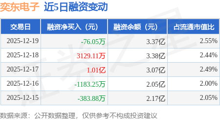 证券之星消息,12月19日,奕东电子(301123)融资买入1.93亿元,融资偿还1.93亿元,融资净卖出76.05万元,融资余额3.37亿元。