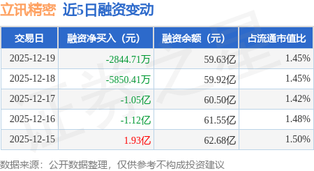 证券之星消息,12月19日,立讯精密(002475)融资买入2.82亿元,融资偿还3.1亿元,融资净卖出2844.71万元,融资余额59.63亿元。