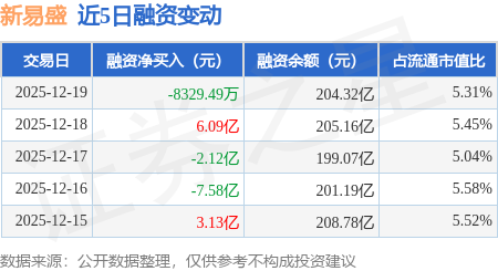 证券之星消息,12月19日,新易盛(300502)融资买入29.08亿元,融资偿还29.91亿元,融资净卖出8329.49万元,融资余额204.32亿元,近20个交易日中有11个交易日出现融资净买入。