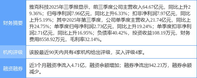 2025年11月11日,太平洋研究员王亮,王海涛发布了对雅克科技的研报《雅克科技2025年三季报点评:电子材料和LNG板材双轮驱动业绩持续增长》,该研报对雅克科技给出“买入”评级。研报中预计2025-2027年EPS分别为2.48元、3.00元、3.55元。维持“买入”评级。证券之星数据中心根据近三年发布的研报数据计算,该研报作者对此股的盈利预测准确度为68.87%。