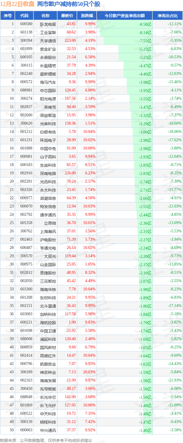 两市散户减持最多的前十只个股为: