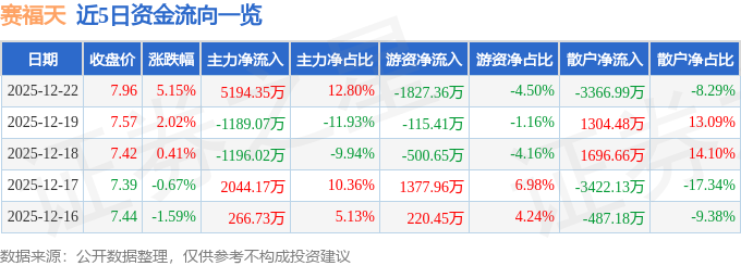 证券之星消息,截至2025年12月22日收盘,赛福天(603028)报收于7.96元,上涨5.15%,换手率17.65%,成交量50.17万手,成交额4.06亿元。