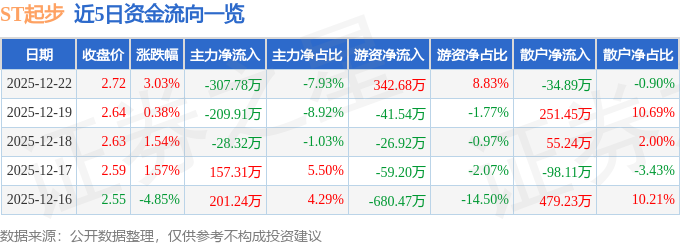 证券之星消息,截至2025年12月22日收盘,ST起步(603557)报收于2.72元,上涨3.03%,换手率2.31%,成交量14.42万手,成交额3878.84万元。