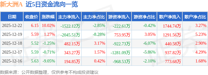 证券之星消息,截至2025年12月22日收盘,新大洲A(000571)报收于6.15元,上涨10.02%,涨停,换手率10.98%,成交量89.38万手,成交额5.34亿元。